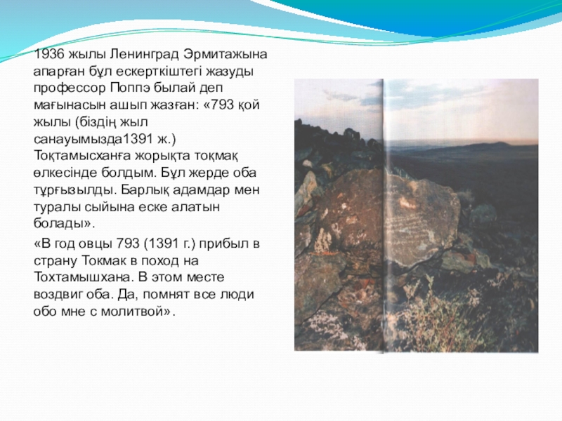 деп мағынасын ашып жазған: «793 қой жылы (біздің жыл санауымызда1391 ж.) Тоқтамысханға жорықта тоқмақ өлкесінде болдым. Бұл жерде оба тұрғызылды. Барлық адамдар мен туралы сыйына еске алатын болады».