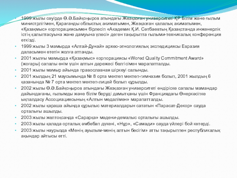 Слайд 291999 жылы сәуірде Ө.Ә.Байқоңыров атындағы Жезқазған университеті ҚР Білім және ғылым