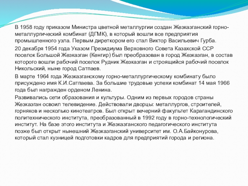 Слайд 11В 1958 году приказом Министра цветной металлургии создан Жезказганский горно-металлургический комбинат