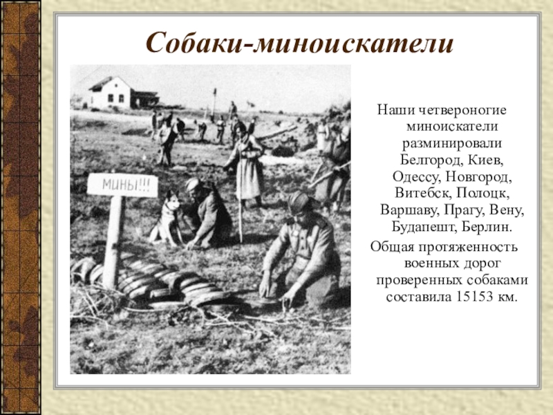 Наши четвероногие миноискатели разминировали Белгород, Киев, Одессу, Новгород, Витебск, Полоцк,