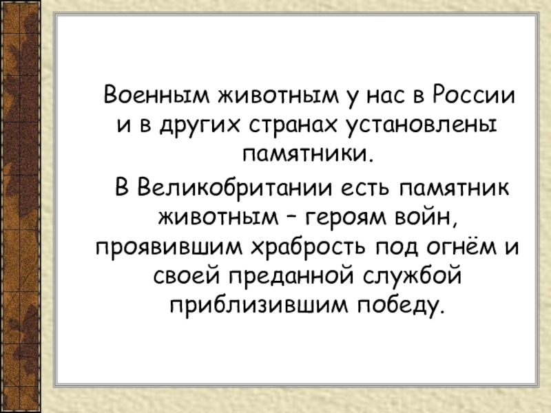 Слайд 21 Военным животным у нас в России и в других