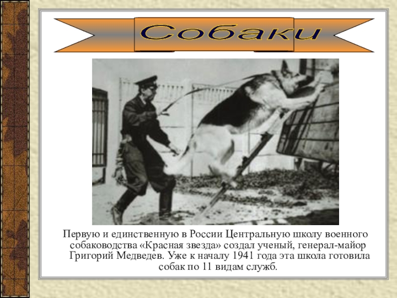 «Красная звезда» создал ученый, генерал-майор Григорий Медведев. Уже к началу 1941 года эта школа готовила собак по 11 видам служб.