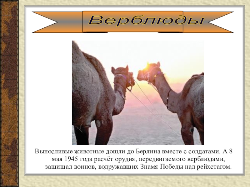 Слайд 17Выносливые животные дошли до Берлина вместе с солдатами. А 8 мая