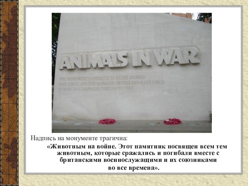 посвящен всем тем животным, которые сражались и погибали вместе с британскими военнослужащими и их союзниками