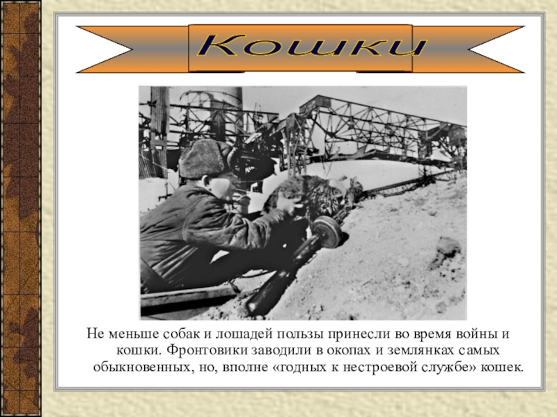 кошки. Фронтовики заводили в окопах и землянках самых обыкновенных, но, вполне «годных к нестроевой службе» кошек.