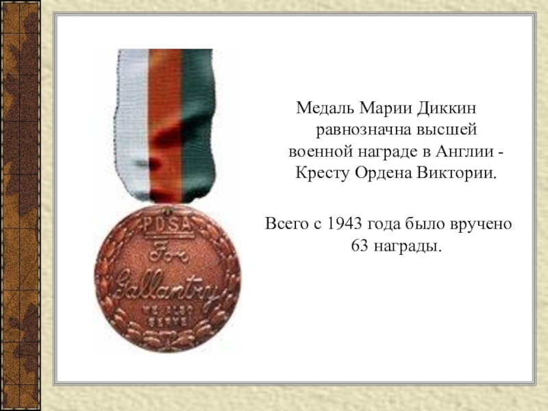 Слайд 20Медаль Марии Диккин равнозначна высшей военной награде в Англии - Кресту