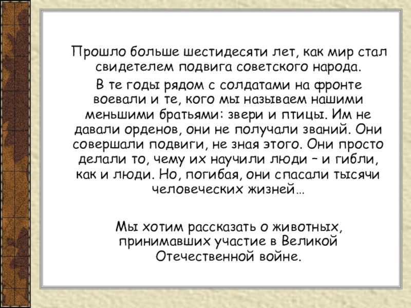 В те годы рядом с солдатами на фронте воевали и те, кого мы называем нашими меньшими братьями: звери и птицы. Им не давали орденов, они не получали званий. Они совершали подвиги, не зная этого. Они просто делали то, чему их научили люди – и гибли, как и люди. Но, погибая, они спасали тысячи человеческих жизней…