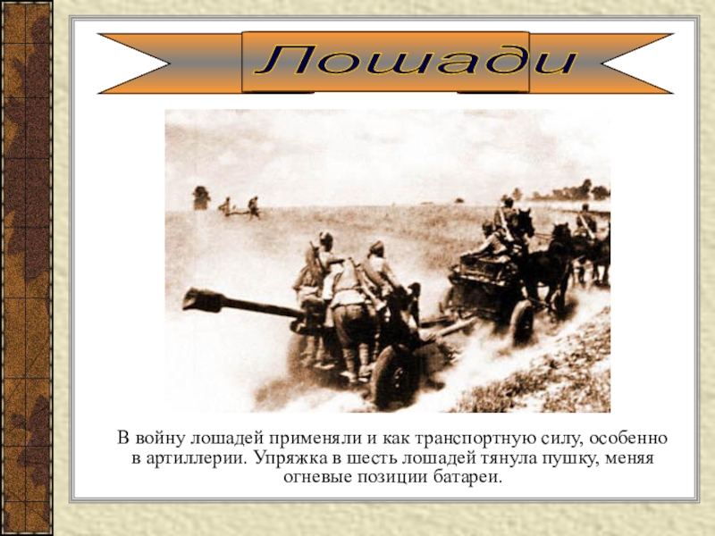 Слайд 4 В войну лошадей применяли и как транспортную силу, особенно