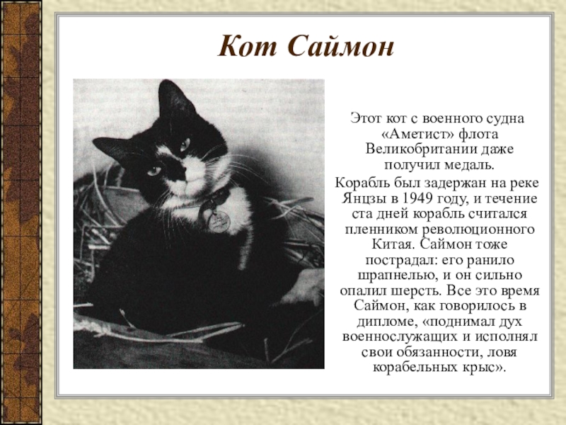 Корабль был задержан на реке Янцзы в 1949 году, и течение ста дней корабль считался пленником революционного Китая. Саймон тоже пострадал: его ранило шрапнелью, и он сильно опалил шерсть. Все это время Саймон, как говорилось в дипломе, «поднимал дух военнослужащих и исполнял свои обязанности, ловя корабельных крыс».