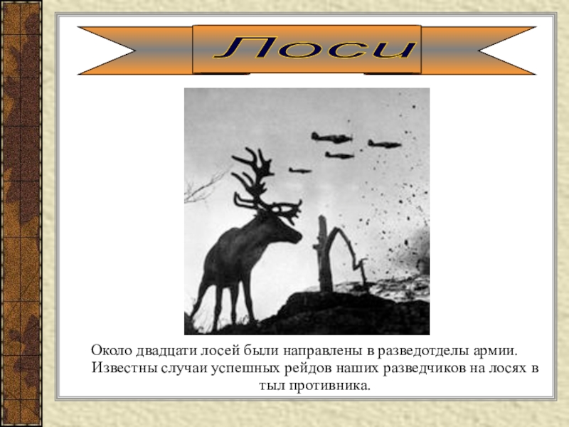 Слайд 18Около двадцати лосей были направлены в разведотделы армии. Известны случаи успешных