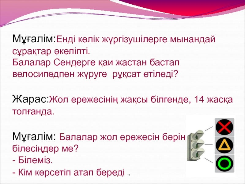 Мұғалім: Балалар жол ережесін бәрін білесіңдер ме?