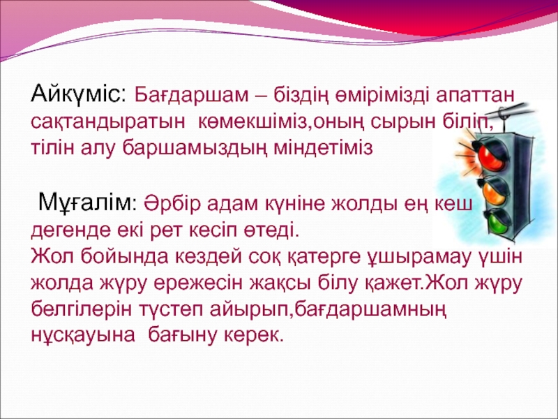 Слайд 6Айкүміс: Бағдаршам – біздің өмірімізді апаттан сақтандыратын көмекшіміз,оның сырын біліп,тілін алу