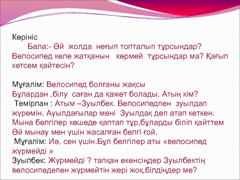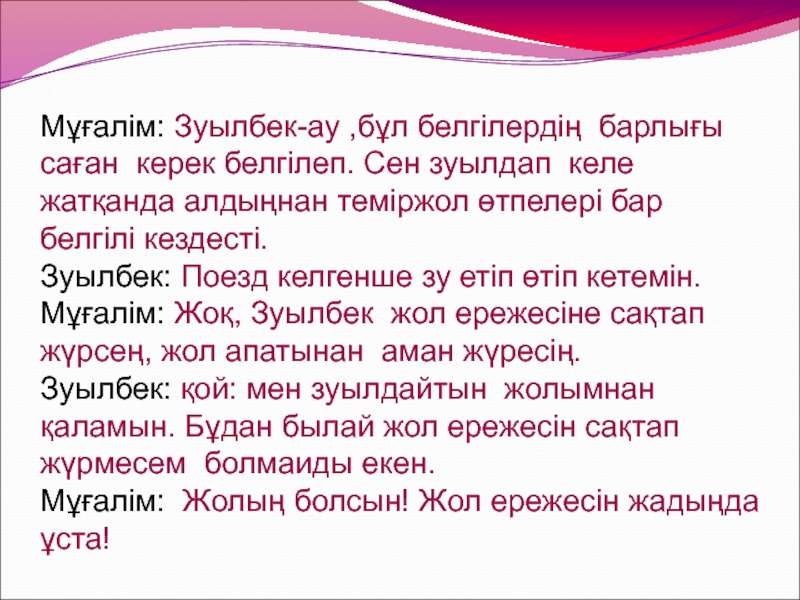 Мұғалім: Жоқ, Зуылбек жол ережесіне сақтап жүрсең, жол апатынан аман жүресің.