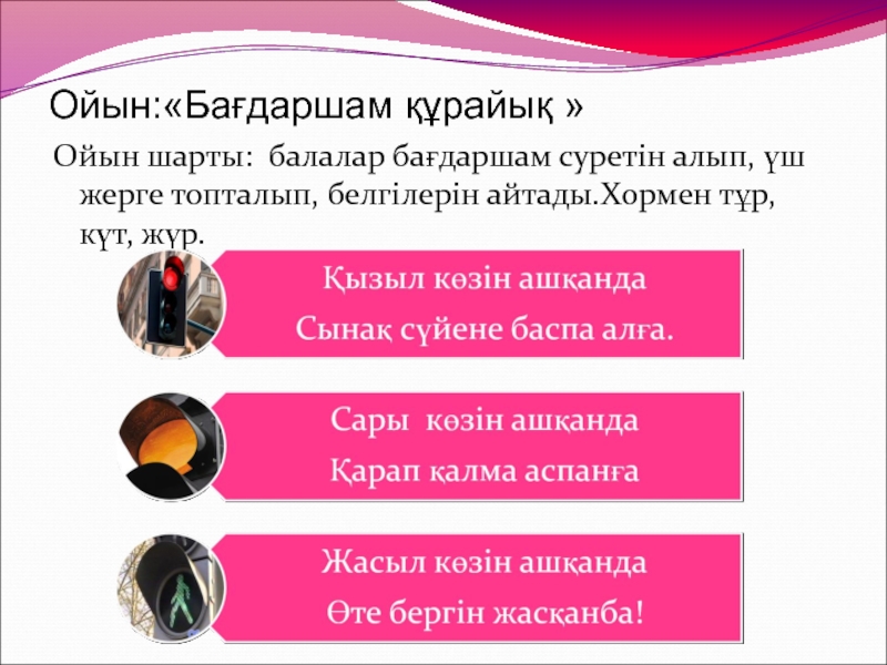 Ойын шарты: балалар бағдаршам суретін алып, үш жерге топталып,