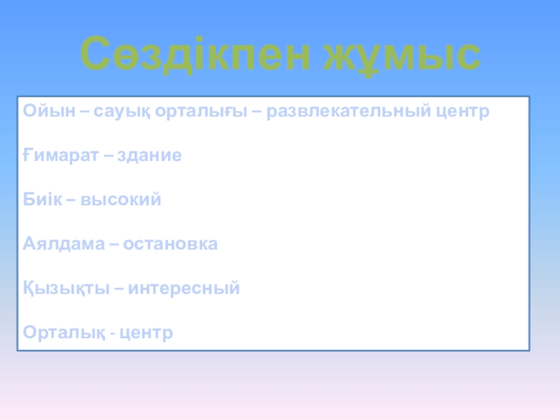 Сөздікпен жұмысОйын – сауық орталығы – развлекательный центрҒимарат – зданиеБиік – высокийАялдама – остановкаҚызықты – интересныйОрталық -