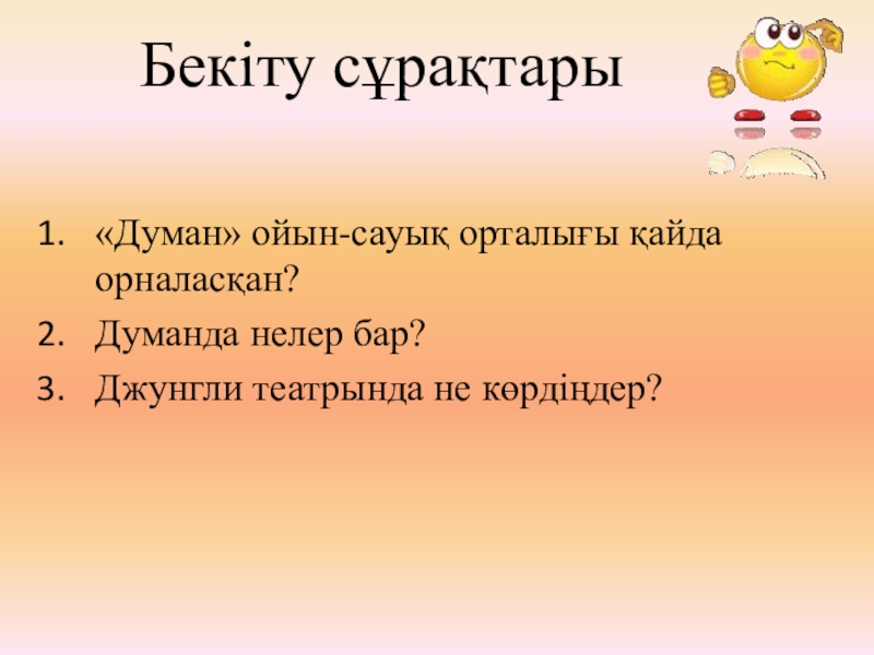 Бекіту сұрақтары«Думан» ойын-сауық орталығы қайда орналасқан?Думанда нелер бар?Джунгли театрында не көрдіңдер?