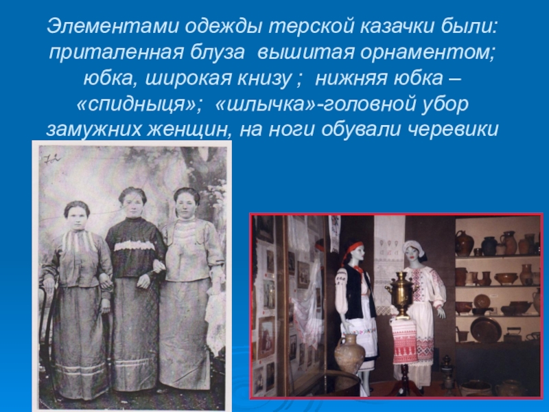 Слайд 9Элементами одежды терской казачки были: приталенная блуза вышитая орнаментом; юбка, широкая