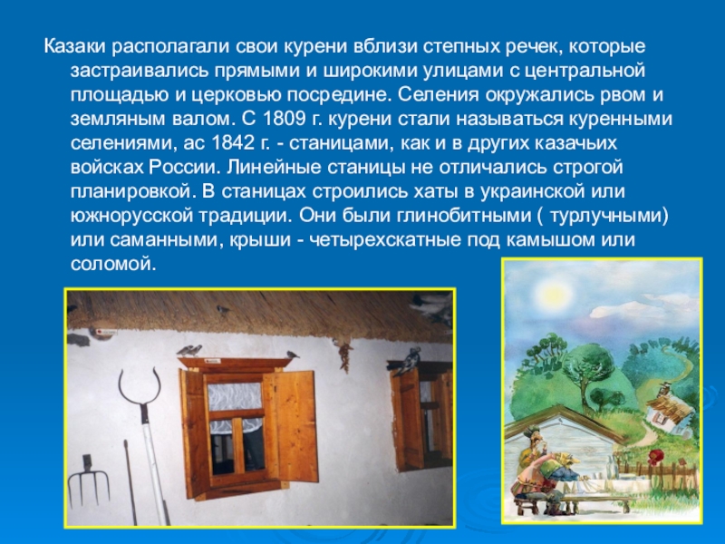 широкими улицами с центральной площадью и церковью посредине. Селения окружались рвом и земляным валом. С 1809 г. курени стали называться куренными селениями, ас 1842 г. - станицами, как и в других казачьих войсках России. Линейные станицы не отличались строгой планировкой. В станицах строились хаты в украинской или южнорусской традиции. Они были глинобитными ( турлучными) или саманными, крыши - четырехскатные под камышом или соломой.