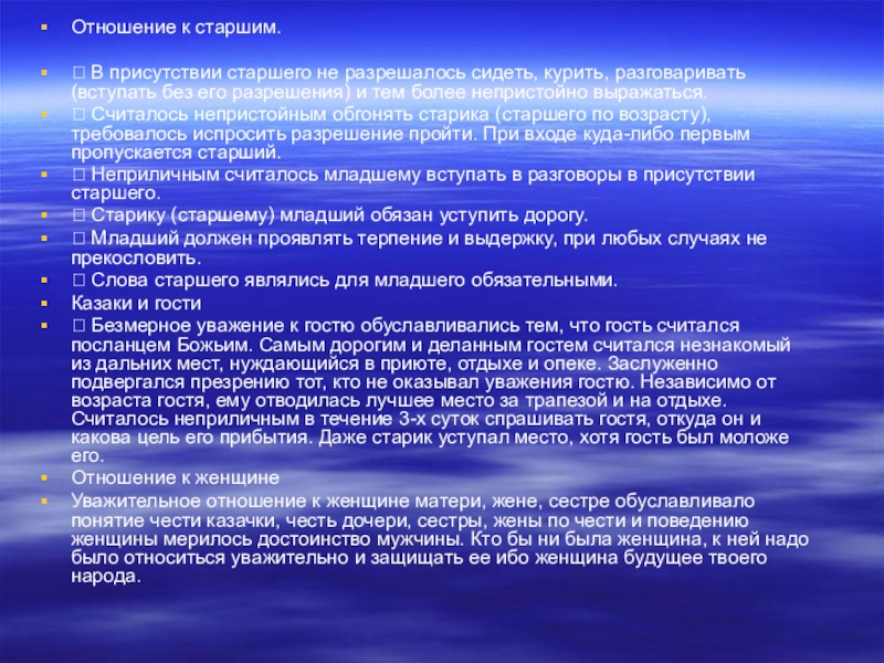 Уважительное отношение к женщине матери, жене, сестре обуславливало понятие чести казачки, честь дочери, сестры, жены по чести и поведению женщины мерилось достоинство мужчины. Кто бы ни была женщина, к ней надо было относиться уважительно и защищать ее ибо женщина будущее твоего народа.