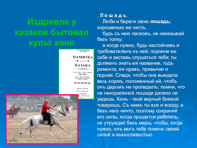 а когда нужно, будь настойчивъ и требователенъ къ ней; подчини ее себе и заставь слушаться тебя; ты долженъ знать ея название, годъ ремонта, ея нравъ, привычки и пороки. Следи, чтобы она выедала весь кормъ, положенный ей, чтобъ онъ даромъ не пропадалъ; помни, что на некормленой лошади далеко не уедешь. Конь - твой верный боевой товарищъ. Съ нимъ ты все и всюду, а безъ него ничто, поэтому сохраняй его силы, когда пршдется работать; не утруждай безъ меры, чтобы, когда нужно, онъ могъ тебе помочь своей силой и выносливостью.