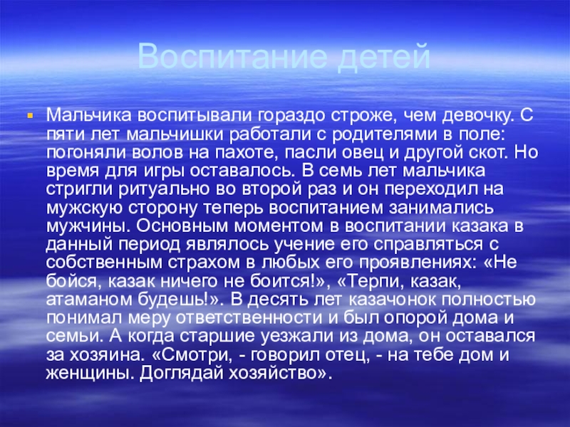 работали с родителями в поле: погоняли волов на пахоте, пасли овец и другой скот. Но время для игры оставалось. В семь лет мальчика стригли ритуально во второй раз и он переходил на мужскую сторону теперь воспитанием занимались мужчины. Основным моментом в воспитании казака в данный период являлось учение его справляться с собственным страхом в любых его проявлениях: «Не бойся, казак ничего не боится!», «Терпи, казак, атаманом будешь!». В десять лет казачонок полностью понимал меру ответственности и был опорой дома и семьи. А когда старшие уезжали из дома, он оставался за хозяина. «Смотри, - говорил отец, - на тебе дом и женщины. Доглядай хозяйство».