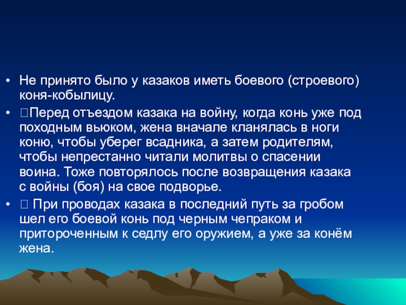 Слайд 17Не принято было у казаков иметь боевого (строевого) коня-кобылицу.