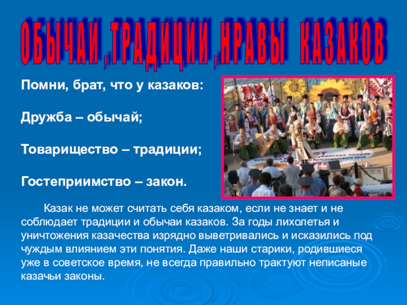 Казак не может считать себя казаком, если не знает и не соблюдает традиции и обычаи казаков. За годы лихолетья и уничтожения казачества изрядно выветривались и исказились под чуждым влиянием эти понятия. Даже наши старики, родившиеся уже в советское время, не всегда правильно трактуют неписаные казачьи законы.