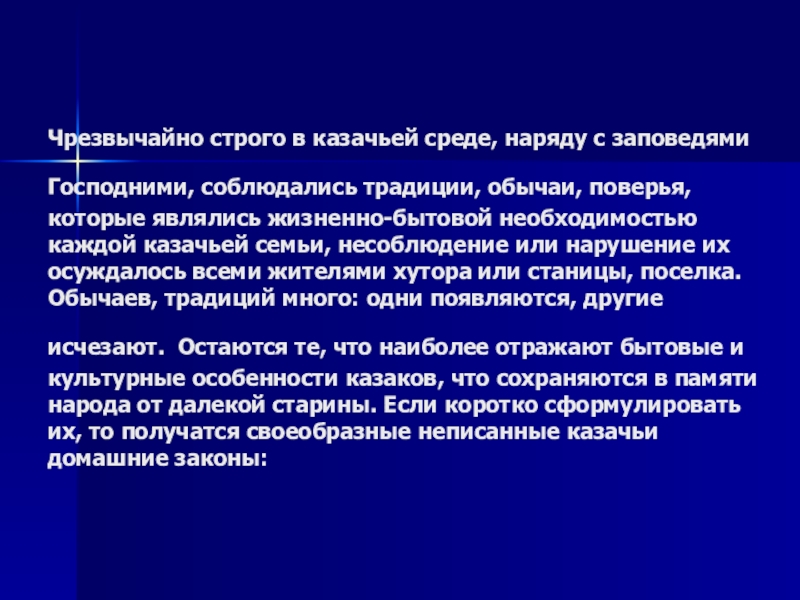 Чрезвычайно строго в казачьей среде, наряду с заповедями Господними, соблюдались традиции,