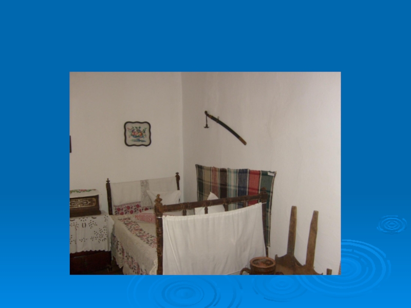 В комнате стоит стол , покрытый кружевной скатертью , связанной крючком. На нем самовар, патефон. На стенах развешены семейные фотографии в рамках. Возле окна на стене висит зеркало в деревянной раме. Земляной пол застелен домоткаными половиками. На полу установлена деревянная прялка с веретеном, а рядом люлька для ребенка.