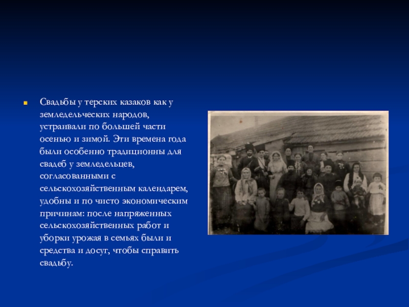 Свадьбы у терских казаков как у земледельческих народов, устраивали по большей