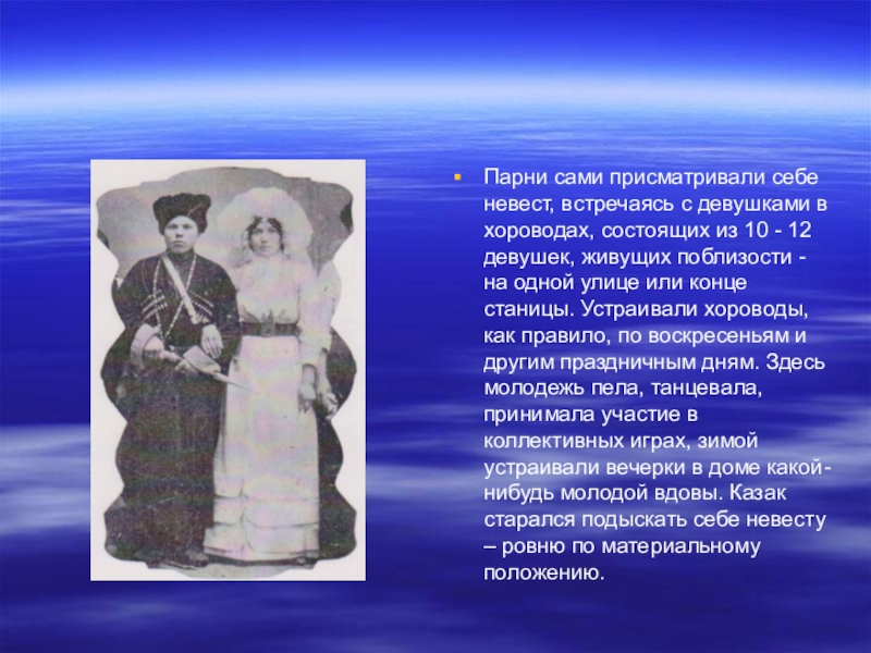 состоящих из 10 - 12 девушек, живущих поблизости - на одной улице или конце станицы. Устраивали хороводы, как правило, по воскресеньям и другим праздничным дням. Здесь молодежь пела, танцевала, принимала участие в коллективных играх, зимой устраивали вечерки в доме какой-нибудь молодой вдовы. Казак старался подыскать себе невесту – ровню по материальному положению.