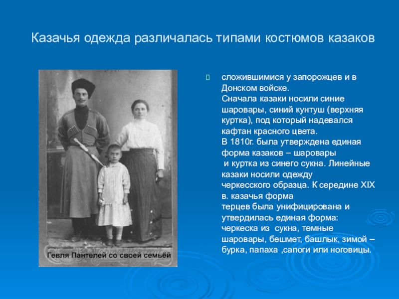 Слайд 8Казачья одежда различалась типами костюмов казаков