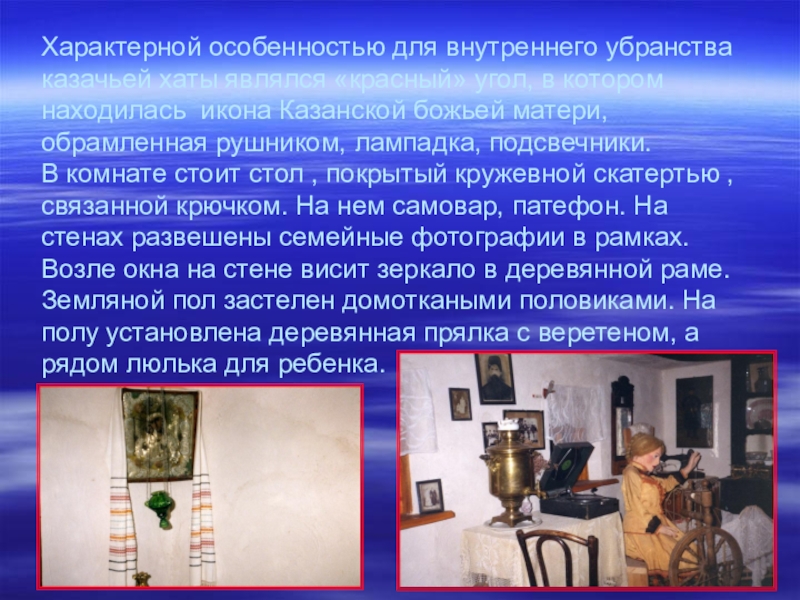Слайд 7Характерной особенностью для внутреннего убранства казачьей хаты являлся «красный» угол, в