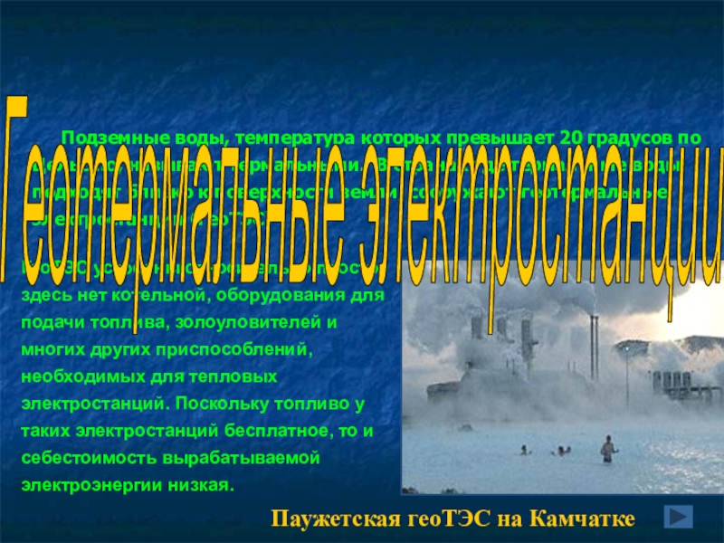 ГеоТЭС устроены относительно просто: здесь нет котельной, оборудования для подачи топлива, золоуловителей и многих других приспособлений, необходимых для тепловых электростанций. Поскольку топливо у таких электростанций бесплатное, то и себестоимость вырабатываемой электроэнергии низкая.
