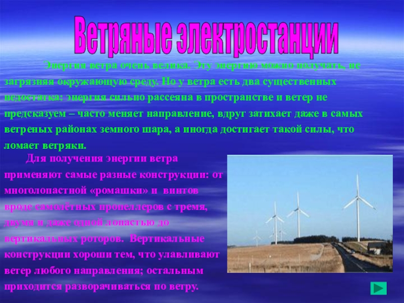 Для получения энергии ветра применяют самые разные конструкции: от многолопастной «ромашки» и винтов вроде самолётных пропеллеров с тремя, двумя и даже одной лопастью до вертикальных роторов. Вертикальные конструкции хороши тем, что улавливают ветер любого направления; остальным приходится разворачиваться по ветру.