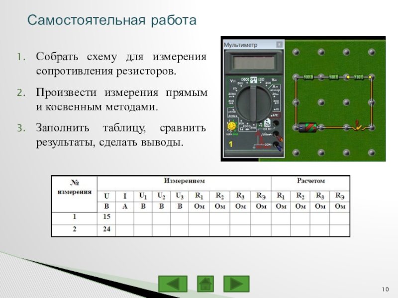 Практическое задание: 2-м обучающимся предлагается собрать на наборной панели схему и произвести измерение параметра радиоэлемента в соответствии с заданием.