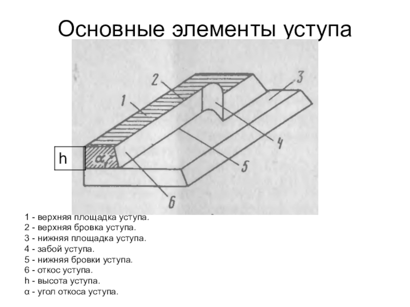 Основные элементы уступа1 - верхняя площадка уступа.2 - верхняя бровка уступа.3 - нижняя площадка уступа. 4 -