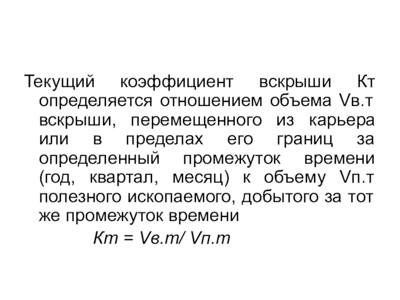 Текущий коэффициент вскрыши Кт определяется отношением объема Vв.т вскрыши, перемещенного из карьера или в пределах его границ