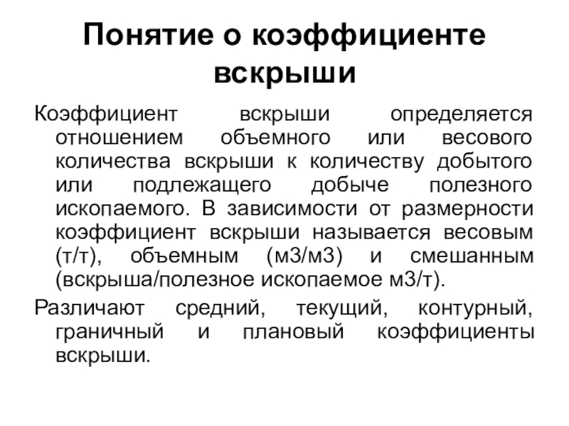 Понятие о коэффициенте вскрыши Коэффициент вскрыши определяется отношением объемного или весового количества вскрыши к количеству добытого или