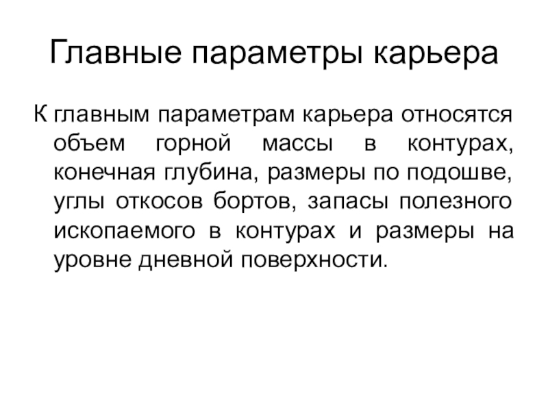 Главные параметры карьераК главным параметрам карьера относятся объем горной массы в контурах, конечная глубина, размеры по подошве,