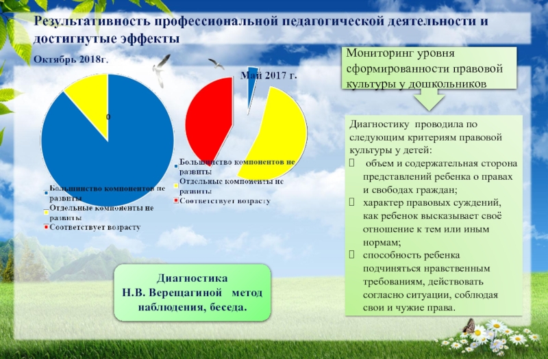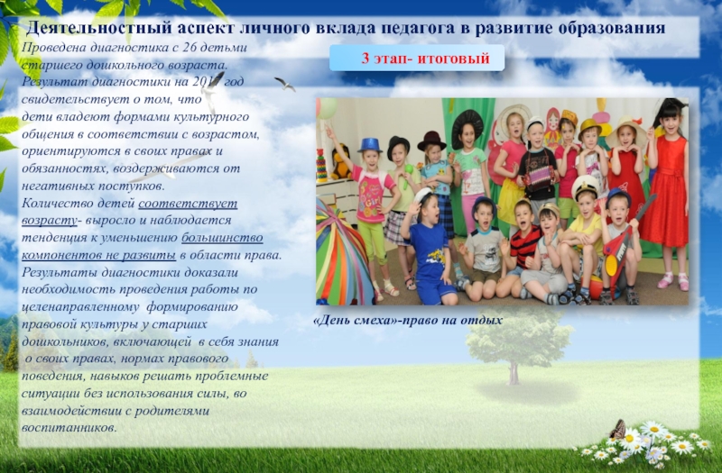 Количество детей соответствует возрасту- выросло и наблюдается тенденция к уменьшению большинство компонентов не развиты в области права. Результаты диагностики доказали необходимость проведения работы по целенаправленному формированию правовой культуры у старших дошкольников, включающей в себя знания