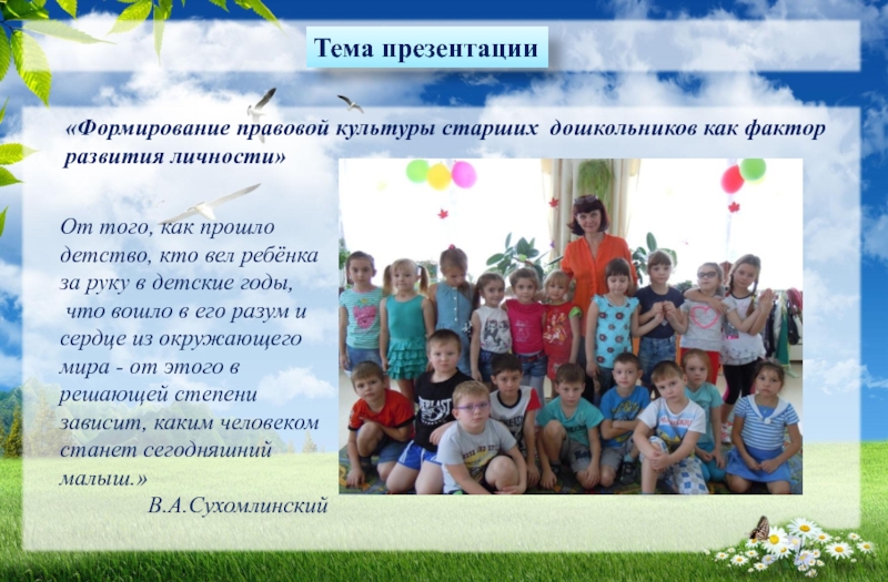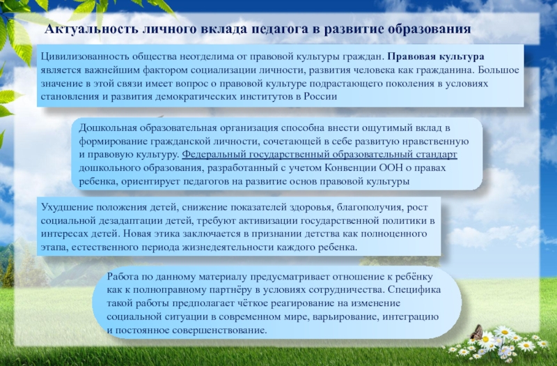 Дошкольная образовательная организация способна внести ощутимый вклад в формирование гражданской личности, сочетающей в себе развитую нравственную и правовую культуру. Федеральный государственный образовательный стандарт дошкольного образования, разработанный с учетом Конвенции ООН о правах ребенка, ориентирует педагогов на развитие основ правовой культуры