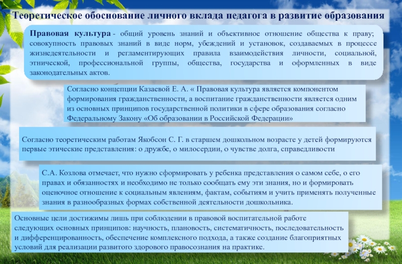 Согласно концепции Казаевой Е. А. « Правовая культура является компонентом формирования гражданственности, а воспитание гражданственности является одним из основных принципов государственной политики в сфере образования согласно Федеральному Закону «Об образовании в Российской Федерации»