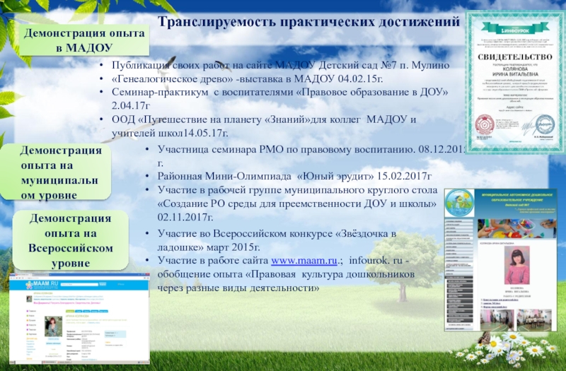 Участие в работе сайта www.maam.ru.; infourok. ru -обобщение опыта «Правовая культура дошкольников через разные виды деятельности»