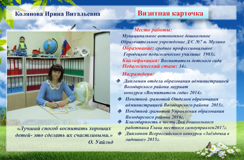 Дипломом отдела образования администрацией Володарского района лауриат конкурса «Воспитатель года» 2014г.
