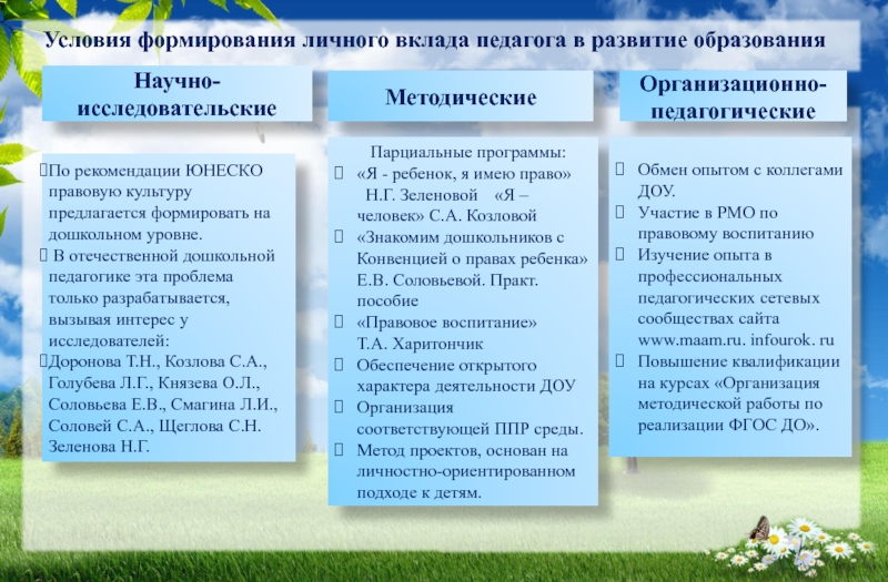 С.А. Козлова отмечает, что нужно сформировать у ребенка представления о самом себе, о его правах и обязанностях и необходимо не только сообщать ему эти знания, но и формировать оценочное отношение к социальным явлениям, фактам, событиям и учить применять полученные знания в разнообразных формах собственной деятельности дошкольника.