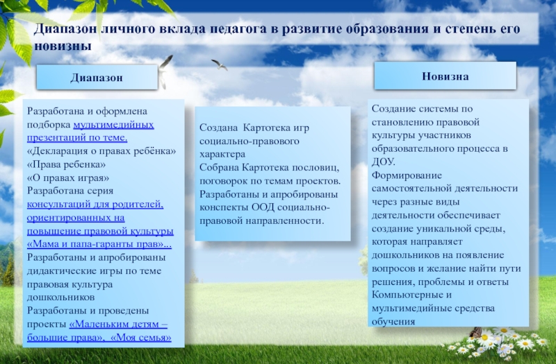 Разработка информационно-методического материала: конспекты занятий, планы, символы-схемы изучаемого права, большая книга для детей «Конвенция о правах ребёнка», демонстрационный материал, дидактические игры, картотеку презентаций, используемых на занятиях, художественную литературу.