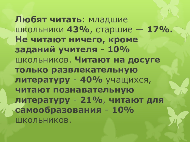 Слайд 9Любят читать: младшие школьники 43%, старшие — 17%. Не читают ничего, кроме