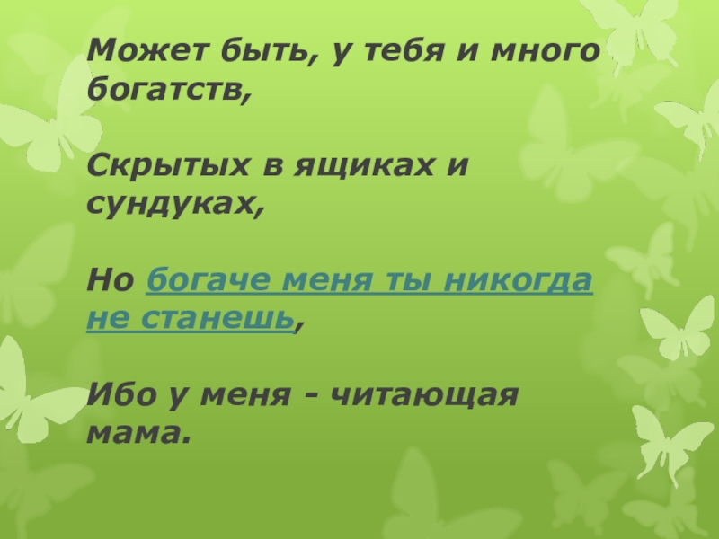 Слайд 18Может быть, у тебя и много богатств,  Скрытых в ящиках и сундуках,  Но богаче