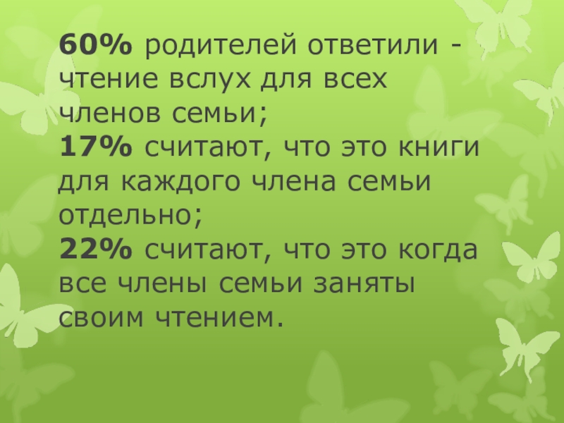 Слайд 1560% родителей ответили - чтение вслух для всех членов семьи; 17% считают,